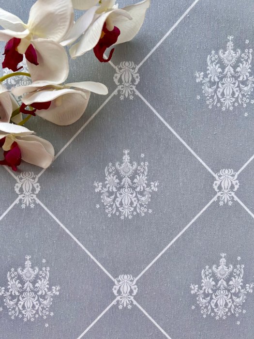 Groot stuk stof, canvas van ongemengd katoen, met een geometrische print met boeketten bloemen.. Geschikte textuur voor muurdecoratie, stoffering en huiswerk.