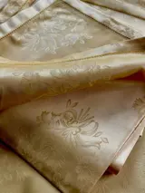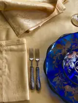 Groot goudgeel vlaanderen tafelkleed van puur katoen met een delicaat bloemenmotief gesigneerd door Emilio Ricci.