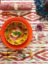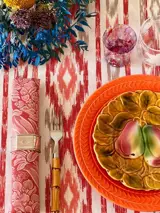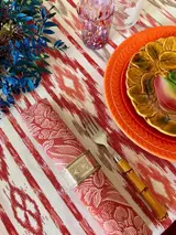 Tafelloper tafelkleed met ikat print in paarse lavendelkleuren, op een uitzonderlijke kwaliteit canvas stof met een dessin.