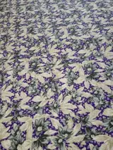 Schitterende Made in Italy-stof met prachtige bloemendecoraties met de prevalentie van ivoor, crème, gelige kleuren en met een achtergrond die verwijst naar de etnische stijl met kleuren zoals paarsgeel, een prachtige combinatie van klassieke en moderne stijl die deze stof tot een bijzonder en origineel stuk.