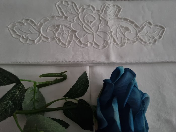 Het laken is inclusief 2 kussenslopen van 100% linnen met handgemaakt diepdrukborduurwerk en satijnsteek
