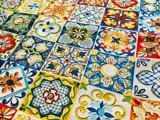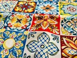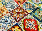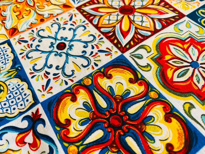 Mooie gemengde linnen en katoenen panamastof met digitale print in het Vietri-thema.