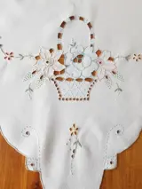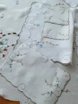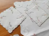 Middendeken en 4 verschillende sets of dekens allemaal met broderie anglaise en geschulpte randen