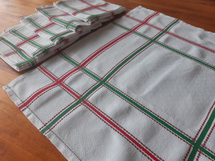 partij servetten met groen/rood patroon (12) - Linnen - Midden 20e eeuw