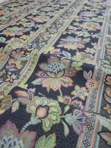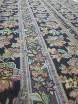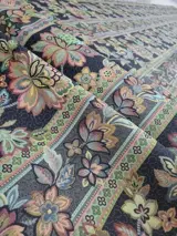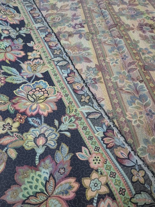 Prachtig Gobelin-brokaat versierd met prachtige bloemmotieven typisch voor Gobelin en verticale parallelle banden die de hele stof kenmerken, allemaal op een zwart / grijze achtergrond en contrasterende kleuren die de stof tot een stuk maken dat herinnert aan de etnische stijl, elegant en modern tegelijk dezelfde tijd.