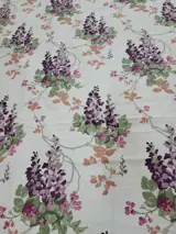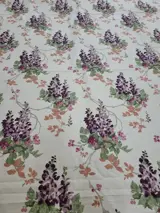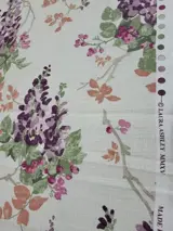 Schitterende stof van een mix van linnen en katoen van Laura Ashley, met prachtige boeketten bloemen gemaakt in een moderne stijl in de kleuren paars en fuchsia met zeer delicate roestkleurige bladeren, alles op een prachtige neutrale achtergrond die de stof elegant en effectief maakt