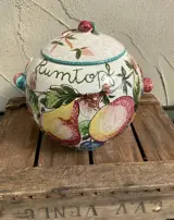 Grote rumpot welke rijk gedecoreerd is met fruit