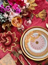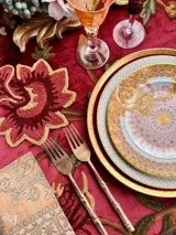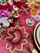 Bourgondisch geschoren fluwelen tafelkleed, met grote handgeborduurde bloemen, kettingsteek, grote boeketten bloemen die het hele oppervlak en de zijkanten bedekken.