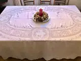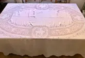Laat 19e en begin 20e eeuws linnen batist tafelkleed geborduurd met linnen draad volgens de "filato" techniek. De versiering is ontstaan door het borduren van acanthusbladeren, trossen, engeltjes en de verkrachting van Europa (met Jupiter, in de gedaante van een stier, met Europa op zijn rug). De grens wordt gekenmerkt door maskers. De lichtheid van deze stof wordt gegeven door zijn gewicht, ondanks zijn grootte: slechts 760 gr.