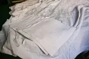 Het tafelkleed heeft kleine steekjes die vervolgens zijn geborduurd met het ajourmotief, zichtbaar in de derde van de laatste en vierde van de laatste afbeelding, waar er gaatjes waren.