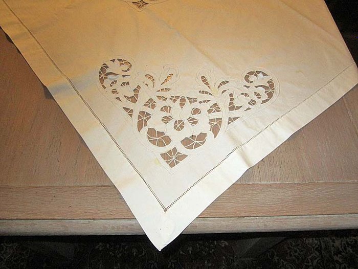 Twee mooie Richelieu tafellakens met opengewerkte decoraties. Het grotere exemplaar heeft een golvende rand en een opengewerkt randje binnen in met het gelijke golfmotief.