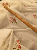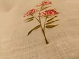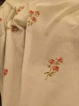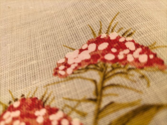 Mooie vintage stof in linnen en dralon mix, met witte achtergrond en rode bloemmotieven.