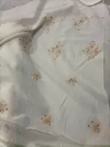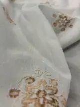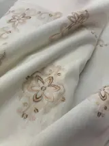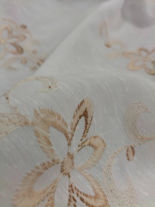 Vintage stof in linnenmix met ruche en lichtbruine geborduurde bloemenstructuur, op een witte achtergrond.
