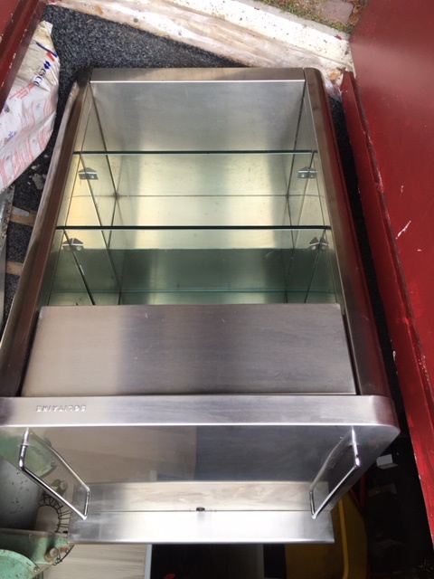 Barwagen RVS van Bosch Solitair voor bijvoorbeeld plaatsing koffiemachine of losse biertap etc. met mooie uittrekbare lade met fijne vakverdeling en daaronder 2 mooie glasplateau's welke in hoogte verplaatsbaar zijn, zolang voorraaad strekt.