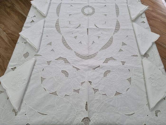 Fijn tafelkleed x 18 groot formaat (inclusief 18 servetten) van puur katoen met opengewerkt borduursel en cordonsteek machinaal en met de hand afgewerkt
