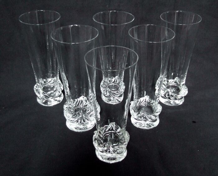 Serie van 6 kristallen champagnefluiten van Daum, model Sorcy. Alle glazen zijn gesigneerd Daum France op de voet.