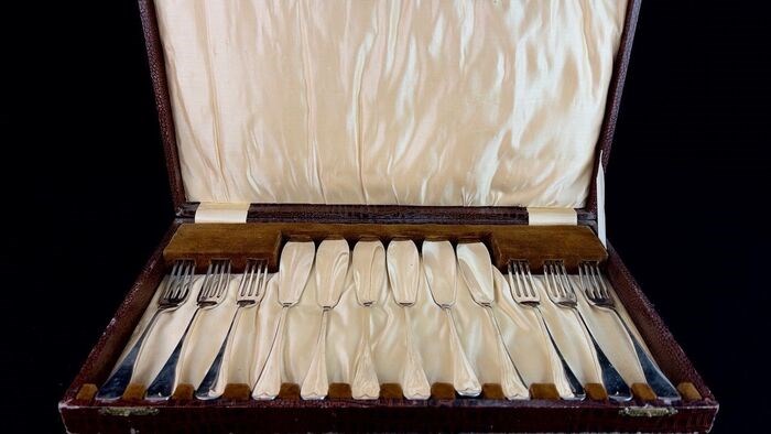 Klassiek elegant 12-delig visbestek in originele doos met messing sluitingen, verzilverd. Britse productie circa 1890-1919. Superieure kwaliteit en conditie,