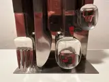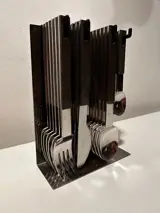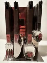 21-delig bestek met houder uit de jaren 60: 6 vorken 6 lepels 4 messen en 5 dessertlepels. Design-object.