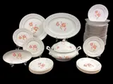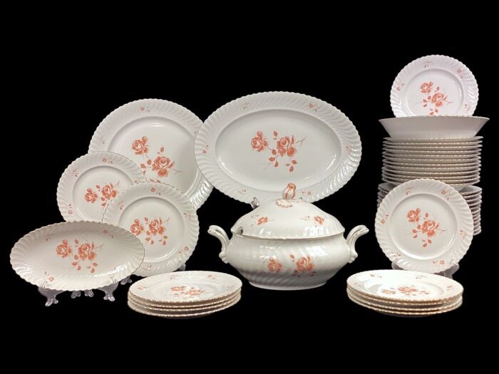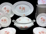 Duits porseleinen servies, Al-Ka Kaiser, voor 12 personen. Het servies van zeer fijn wit porselein is gedecoreerd met koraalkleurige bloemmotieven met kleine witte tinten die diepte geven aan de afgebeelde bloemen. De rand is golvend en herinnert aan de beweging van de golven van de zee, een stijl die door veel prestigieuze porseleinmerken wordt overgenomen. Het profiel van de gerechten is in goud vermeld, de knop van de terrine is een kleine granaatappelvrucht; deze service wordt gekenmerkt door bijzondere aandacht voor elk detail.