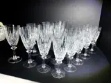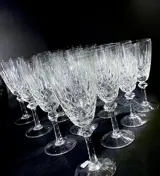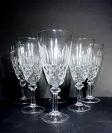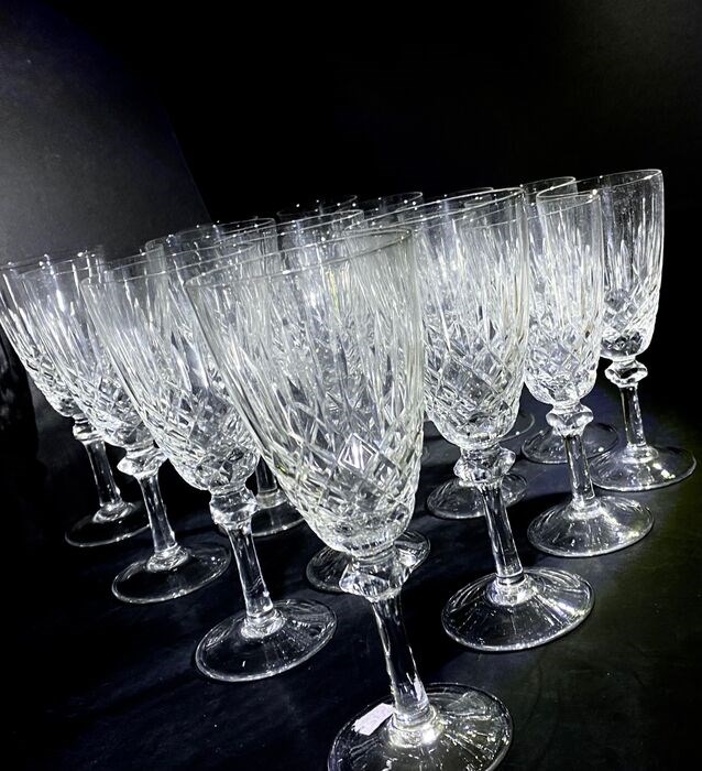 Voormalige Koninklijke Kristalfabriek van Frankrijk, Servies van oude glazen Handgeslepen model uit de Art Deco periode Toegeschreven aan Saint Louis maar zonder signatuur vanwege de tijd daarvoor. kristalhelder en reflecteert het licht uitstekend. het servies in helder kristal en bestaat in wezen uit 18 glazen. in perfecte staat . Hier dus 8 grote waterglazen (18 cm) en 10 wijnglazen (16 cm)