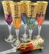Zes prachtige glanzende, sprankelende, massieve en prismatische edelstenen, in een beperkte oplage en absoluut onbereikbaar behalve in mijn veilingen, presenteer ik u deze overtreffende trap van fluiten in geblazen kristal, gegraveerd en versierd met 24Kt puur goud door Venetiaanse meestersambachtslieden die altijd verbaasden onze gasten aan tafel met hun wonderen.