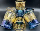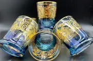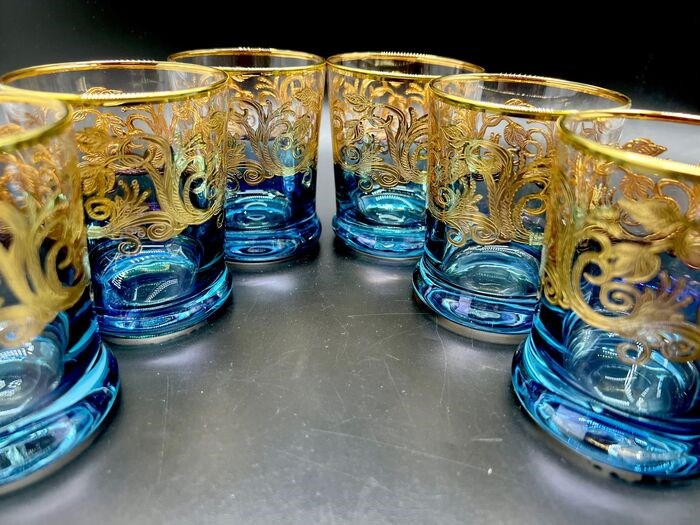 Luxe whiskyglazen rondom fraai gedecoreerd met pantograaf met arabeskmotieven in 24Kt goud. Verlicht door een intens kobaltblauw en rijk aan metaalachtige reflecties, een echte betovering geschonken door de bekwame en deskundige handen van ambachtslieden die, volgens de Murano-school, er altijd naar streven onze gasten aan tafel te verbazen.