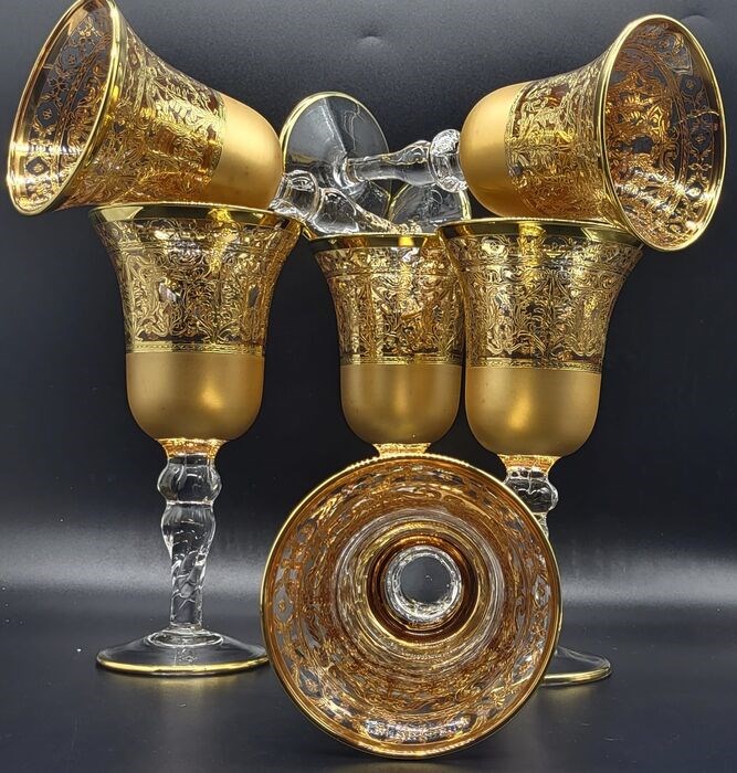 Prachtige lichtflitsen en natuurlijke pracht voor deze grote, imposante en massieve tafelglazen. Volledig met de mond geblazen, ondersteund door een heel bijzondere steel en volledig badend in puur goud, zullen ze niet onopgemerkt blijven. Als je je tafel wilt verlichten voor een feestje, dan is dit de juiste set.