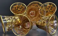 Elke beker is individueel bewerkt, met de mond geblazen, met een torchon-steel in een delicaat Murano-roze dat fungeert als een voetstuk voor een imposant lichaam badend in puur goud op de bodem en belangrijke borduursels, allemaal verhoogd met pantograaf en beschilderd met een penseel met 24kt. Eindelijk gaar in de oven op hoge temperaturen