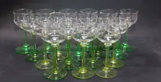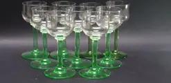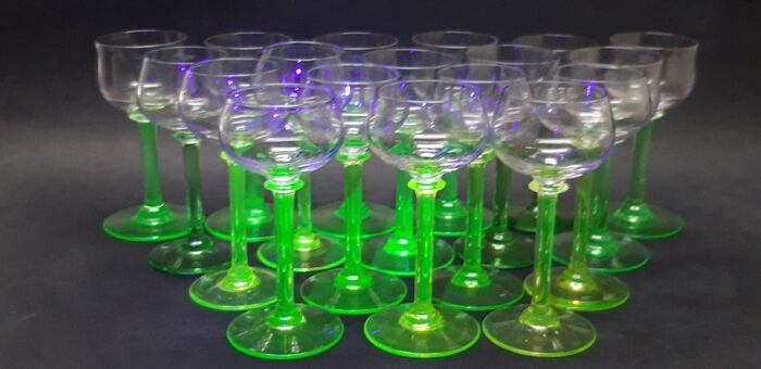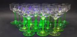 18 handgeblazen likeurglazen uit de Art Deco-periode. Gemaakt van uraniumglas (vaseline-glas) in de jaren 1920-1930.