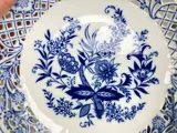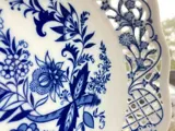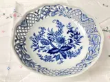 Een mooie ronde serveerschaal met het bekende Blue Onion Decor. Gesigneerd "Arzberg". Geproduceerd in Duitsland ergens tussen de jaren 20-50. Ik heb een grote collectie van deze opengewerkte porseleinen stukken, hou gewoon van de delicate kanten look. Dit is een van de mooiste opengewerkte stukken die ik heb gezien, omdat alle openingen een andere vorm hebben en het ingewikkelde patroon volgen.
