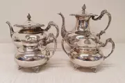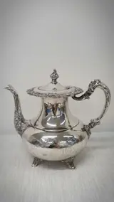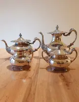 Prachtig verzilverd thee- en koffieservies in het Ascot Sheffield-patroon van Community art nouveau-stijl. Elk stuk heeft een bloemmotief rond de rand en bloementuiten, voeten en handvatten met geëtste ontwerpen op het lichaam. Een mooie en degelijke set. Deze dienst bevat