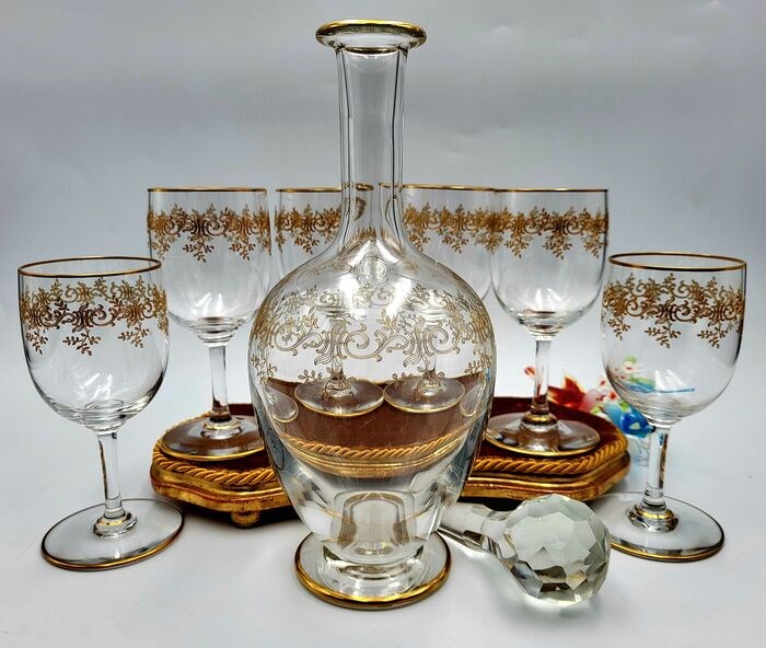 Baccarat, geliefd bij royalty's, uitstekende service van zes wijnglazen en de fles in mondgeblazen kristal, met de hand bewerkt en gesneden met de perfectie van prestigieus vakmanschap in de constante zoektocht naar perfectie, begonnen vanaf het jaar 1764 tot vandaag