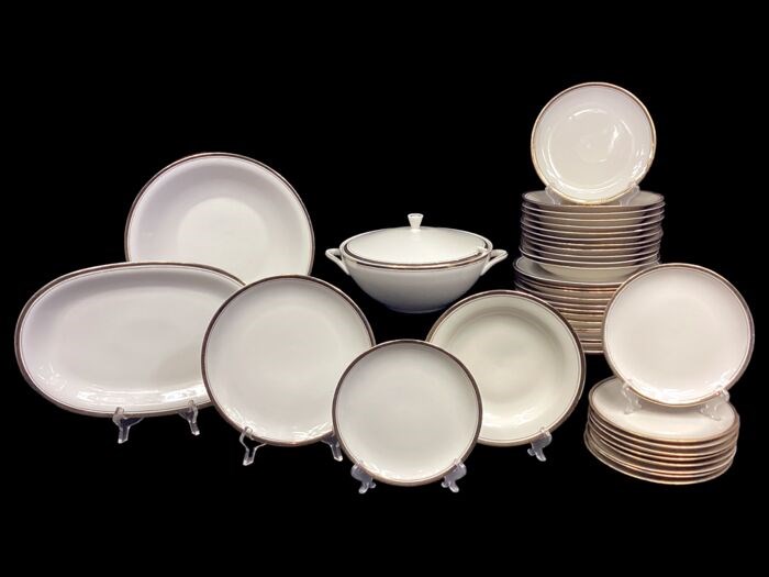 Elegant servies voor 12 personen, merk Bavaria. De elementen hebben een verfijnde Griekse fret in goud.