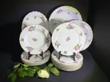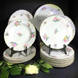 Polychrome illustratie van een boeket bloemen en de rand gesneden en verguld met fijn goud. Het porselein van kwaliteit en doorschijnend in het licht - zie mijn foto's. Hier: 8 grote platte borden van 24 cm, 4 soep- of groenteborden en 2 grote presentatieborden (31 cm en 29 cm) een grote ovale schaal (33 cm) komen overeen met andere collecties.