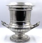 Champagne-emmer van zilverkleurig metaal in de vorm van een Medici-vaas op een voetstuk, versierd met gadrons en twee stenen handvatten.