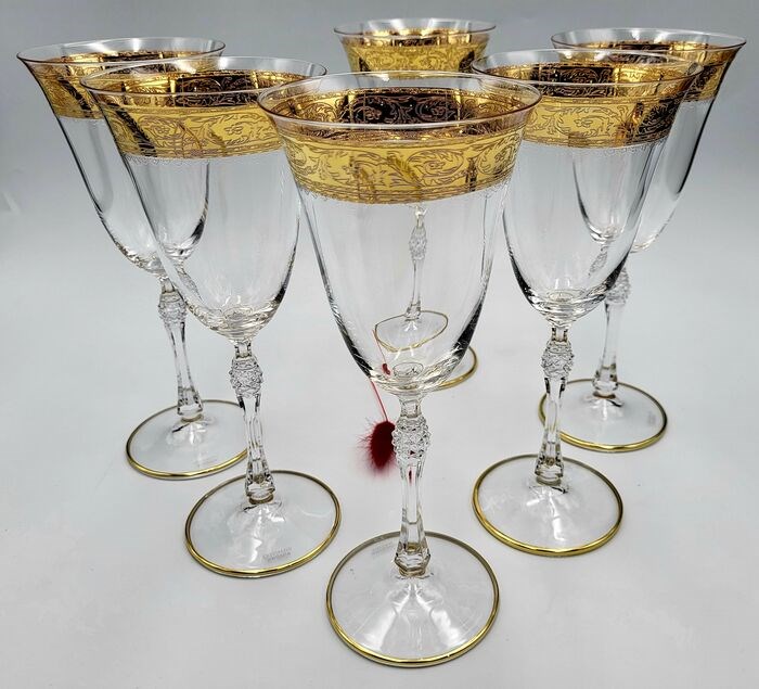 Schitterende en kostbare set wijnglazen in Boheems kristal, volledig met de hand bewerkt met decoratieve vergulde afwerkingen in puur goud gezet in het kristal.
