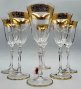 Schitterende en kostbare set wijnglazen in Boheems kristal, volledig met de hand bewerkt met decoratieve vergulde afwerkingen in puur goud gezet in het kristal.