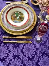 Lavendel damast brokaat tafelkleed met klassieke print, geen acryl blends, machinewasbaar, goed te combineren met feestelijk servies en vlek- en schadevrij.