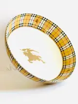 Deze Vintage Burberry's of London Fine Bone China Bowl, compleet met het Burberry's Equestrian Knight-logo en kenmerkende Thistle tartan plaid, heeft het Burberry's handelsmerklogo, de Burberry-strikemblemen met het kenmerkende Haymarket-patroon op zowel de binnen- als buitenranden. De Bowl is afgewerkt met de beroemde Burberry-ruit met prachtige gouden vergulding aan de buitenrand en afgewerkt met hoogwaardige, heldere kunstwerken en glanzende beglazing met een hoge mate van witheid en doorschijnendheid.