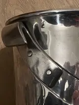 Fraaie professionele en sierlijke kwaliteitskoeler, gemaakt uit hoog gepolijst metaal, met in het metaal verwerkte cordons (linten) welke in de handvatten doorlopen.