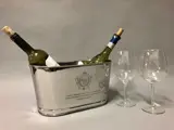 Grote vernikkelde kom in ovale vorm voor champagne- of wijnflessen met aan twee zijden gegraveerde tekst van Lily Bollinger en Napoleon Bonaparte.