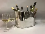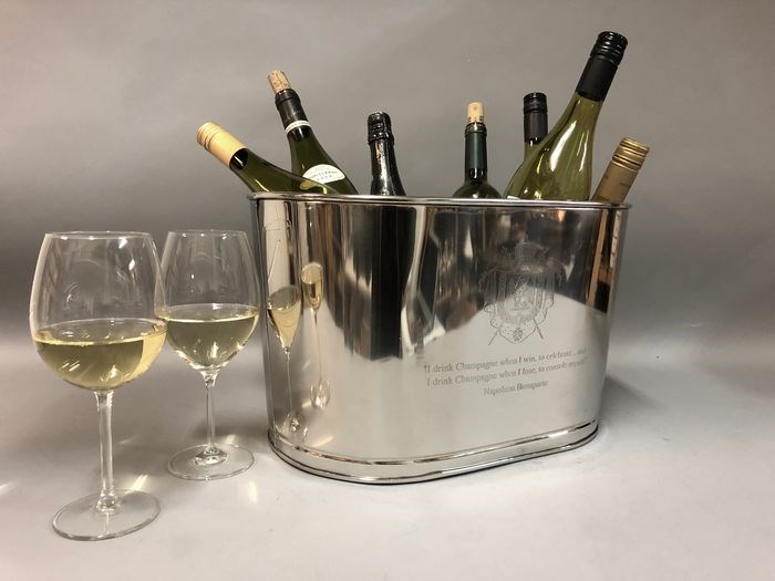 Grote vernikkelde kom in ovale vorm voor champagne- of wijnflessen met aan twee zijden gegraveerde tekst van Lily Bollinger en Napoleon Bonaparte.