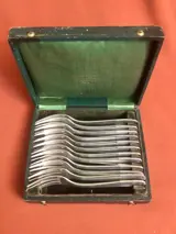 Christofle, Parijs, omstreeks 1930. Gallia-productie. ART DECO model van Charles Alphen , set dessertvorken voor twaalf personen. Elk gekeurd en met verschillende stempels. Zeer goede conservering, glanzend, klaar voor gebruik, zal profiteren van een mooie reiniging en polijsten tot volledig glanzend. 15 gr. van fijn zilver om de set te plateren.