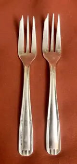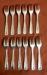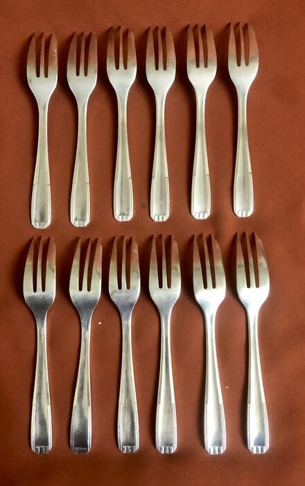 Christofle, Parijs, omstreeks 1930. Gallia-productie. ART DECO model van Charles Alphen , set dessertvorken voor twaalf personen. Elk gekeurd en met verschillende stempels. Zeer goede conservering, glanzend, klaar voor gebruik, zal profiteren van een mooie reiniging en polijsten tot volledig glanzend. 15 gr. van fijn zilver om de set te plateren.