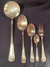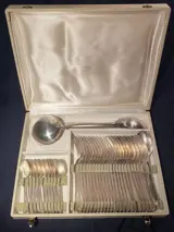 Complete zilveren metalen huisvrouw inclusief een pollepel, een stooflepel, 12 vorken, 12 lepels en 11 kleine lepels gemaakt van Frankrijk tijdens de art deco periode door het beroemde Christolfe goudsmid huis.
