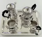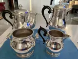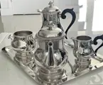 Prachtig vintage Ercuis servies (niet van Christofle Malmaison te onderscheiden). Subtiele, uitgebalanceerde, tijdloze ontwerpelementen terwijl de body van elk een strakke, spiegelachtige afwerking behoudt. Scharnieren, handgrepen, tuiten - allemaal functioneel/geen schade. Binnenkant duidt op zeer beperkt of geen daadwerkelijk gebruik. Gratis meegeleverde lade toont uitgebreid gebruik, maar geweldige vorm/vorm.