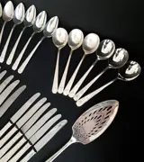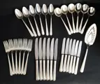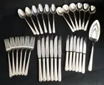 31-delige bestekset, zwaar verzilverd bestek, patroonklemmen. De set bestaat uit: 6 botermesjes, 6 dinermesjes, 6 dinervorken, 6 soeplepels, 6 dessertlepels, 1 taartschep. Minimaal gebruik goede kwaliteit en staat.