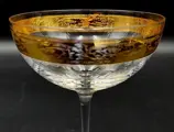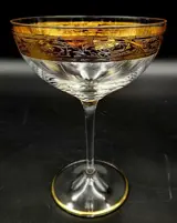 Set van 6 champagneglazen. Afmetingen: hoogte 15,5 cm x diameter 11 cm in gebeiteld, mondgeblazen kristal, vintage van Cre Art Srl, decoratie Versailles, opgericht in 1968, gelegen in de provincie Florence, daterend uit de tweede helft van de 20e eeuw. Een van de beste Toscaanse producenten. Zeer zeldzaam en zeer gewild. Allemaal handgemaakt en afgewerkt in 24 karaats goud in de bovenrand en ronde basis. Een uit duizenden. Dit item is met de hand gedecoreerd door meestervaklieden met 100% hooggebakken goud.