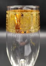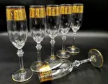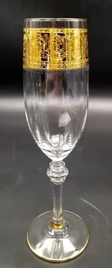 Set van 6 fluitglazen in geslepen, geciseleerde, mondgeblazen vintage Cre Art Srl Aurea-decoratie, opgericht in 1968, gelegen in de provincie Florence, daterend uit de tweede helft van de 20e eeuw. Een van de beste Toscaanse producenten. Zeer zeldzaam en zeer gewild. Allemaal met de hand gemaakt, gesneden, zeshoekig gefacetteerde poot. Een uit duizenden. Afmetingen: hoogte 22,5 cm x diameter 4,8 cm.