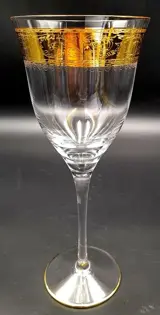 Set van 6 wijnglazen. Afmetingen: hoogte 22,8 cm - diameter 8,9 cm in geslepen kristal, mondgeblazen vintage door Cre Art Srl "Versailles" decoratie, opgericht in 1968, gelegen in de provincie Florence daterend uit de tweede helft van de 20e eeuw. Een van de beste Toscaanse producenten. Zeer zeldzaam en zeer gewild. Allemaal handgemaakt en afgewerkt in 24 karaats goud in de bovenrand en in de voet, tulpbeker. Een uit duizenden. Dit item is met de hand gedecoreerd door meestervaklieden met 100% hooggebakken goud.